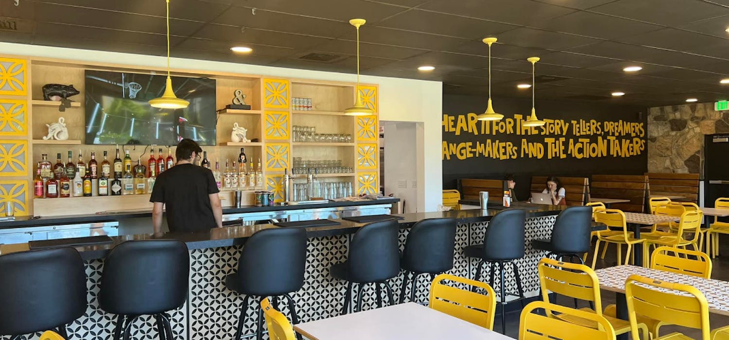 The interior design blends rustic beech wood elements and industrialized metals with modern materials and warm saffron yellow tones. Unique design features like laser cinder block columns with back-lit frosted panels in the bar and an abstract turnip logo displayed in the custom laminate as part of the tabletop design, create confidence that guests will experience something more than the ordinary dining experience here.