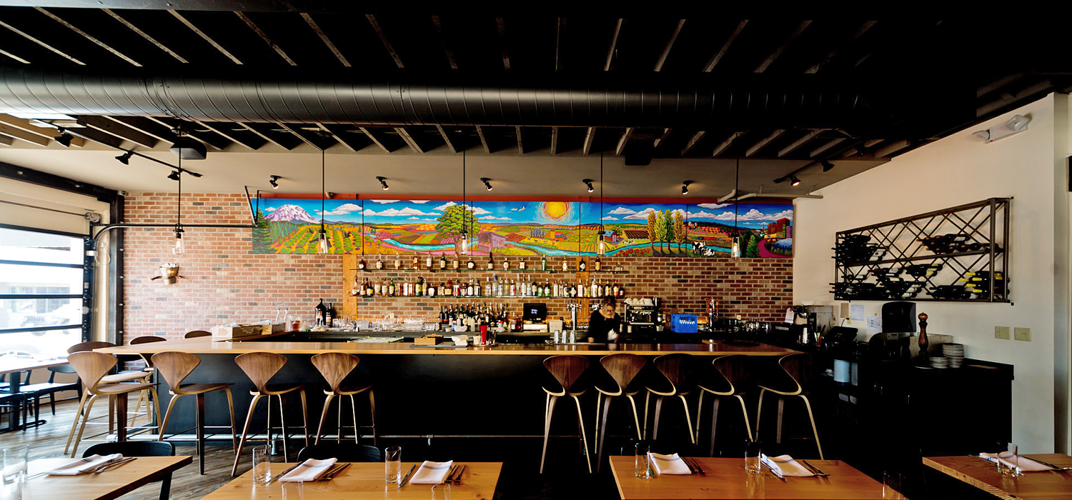 The Bargreen Ellingson team was thrilled to reunite with the owners of Primo Grill for a complete renovation of their restaurant’s new location. Incorporating elements inspired by the local art community played an integral part when conceptualizing the design of their new space. Upgrading the integrity of the establishment presented a unique challenge when converting the former turn-of-the-century post office into a kitchen and private dining room. Exposed support beams acted as a decorative accent to frame the colorful mural artwork that frames the minimalistic barback.